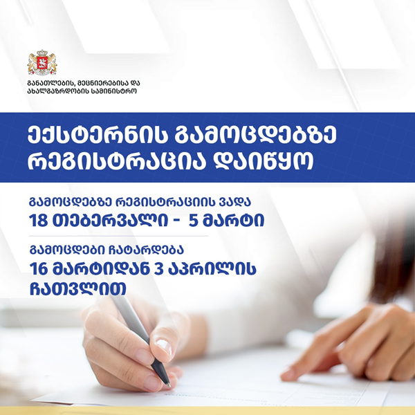 საქართველოს განათლების, მეცნიერებისა და ახალგაზრდობის სამინისტრომ ზოგადი განათლების I-XII კლასის/კლასების/სემესტრის, ასევე I-XII კლასში/სემესტრში შემავალი საგნის/საგნების ზოგადსაგანმანათლებლო სასწავლო პროგრამის/პროგრამების ექსტერნატის ფორმით დაძლევის გამოცდის ჩატარებისა და ექსტერნად რეგისტრაციის ვადები დაადგინა.