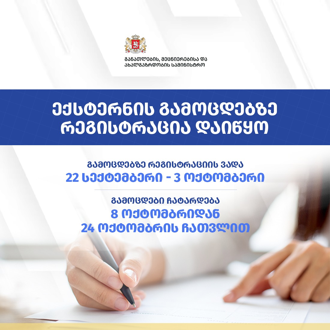 საქართველოს განათლების, მეცნიერებისა და ახალგაზრდობის სამინისტრომ ზოგადი განათლების I-XII კლასის/კლასების/სემესტრის, ასევე I-XII კლასში/სემესტრში შემავალი საგნის/საგნების ზოგადსაგანმანათლებლო სასწავლო პროგრამის/პროგრამების ექსტერნატის ფორმით დაძლევის გამოცდის ჩატარებისა და ექსტერნად რეგისტრაციის ვადები დაადგინა.