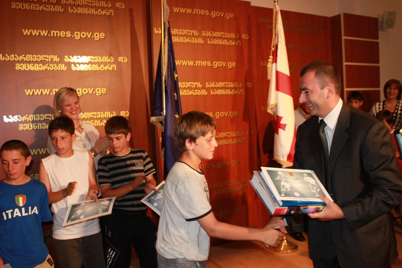 საქართველოს განათლებისა და მეცნიერების მინისტრი დიმიტრი შაშკინი, სპორტის, ახალგაზრდობის საქმეთა მინისტრის მოადგილე დავით ნამგალაური მოსწავლეთა საფეხბურთო ტურნირის - ”სკოლბურთი” ფინალისტებს შეხვდნენ და ორი გამორჩეული ბომბარდირი - ზუგდიდის №4 საჯარო სკოლის გუნდიდან დიმიტრი თუთბერიძე და გიორგი ქობულაძე ბოლნისის პირველი საჯარო სკოლის გუნდიდან პორტატული კომპიუტერებითა და წიგნებით დააჯილდოვა. სამახსოვრო საჩუქრები მიიღეს ორივე გუნდის დანარჩენმა წევრებმაც.