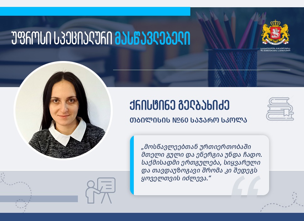 „საყვარელ საქმეში ცდილობ მთელი გული და ენერგია ჩადო. მუდმივად საკუთარ თავზე მუშაობა და პროფესიული განვითარება ძალიან მნიშვნელოვანია, რაც დღემდე არ შემიწყვეტია“, - ამბობს თბილისის №60 საჯარო სკოლის სპეციალური პედაგოგი ქრისტინე გელბახიძე, რომელიც შესაბამისი სამაგისტრო განათლების საფუძველზე 2021 წლიდან უფროსი სპეციალური მასწავლებელი გახდა.