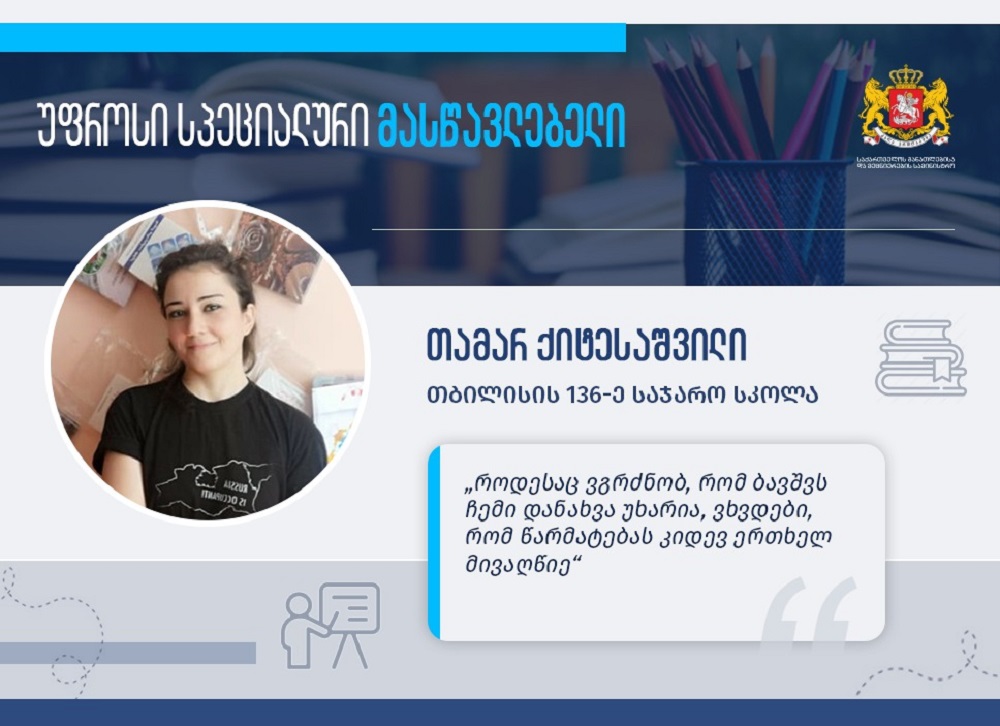 „თვითგანვითარებაზე ზრუნვა და მუდმივი ძიება წარმატებული მუშაობისთვის გადამწყვეტი ფაქტორია“ – მიაჩნია თბილისის №136 საჯარო სკოლის სპეციალურ მასწავლებელს თამარ ქიტესაშვილს, რომელსაც წლის დასაწყისში უფროსი სპეციალური მასწავლებლის სტატუსი მიენიჭა და ერთ-ერთი წარმატებული პედაგოგი გახდა. ამავდროულად, ის საქართველოს წითელი ჯვრის მოხალისეა, რაც მისთვის ასევე ძალიან საამაყოა. თუმცა, დატვირთული სასწავლო პროცესის მიუხედავად, ფიქრობს, რომ თვითგანვითარებაზე ზრუნვა, მეტი პრაქტიკული გამოცდილება და მუდმივი ძიება წარმატებული მუშაობისთვის გადამწყვეტი ფაქტორია.