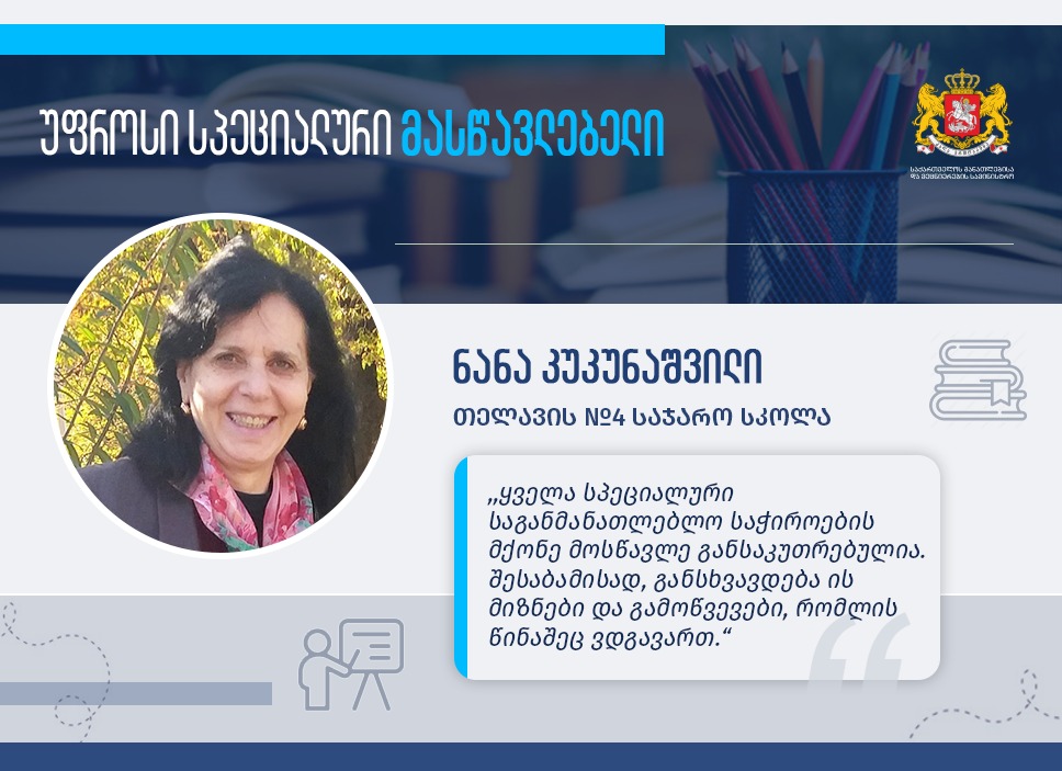 „ყველა სპეციალური საგანმანათლებლო საჭიროების მქონე მოსწავლე განსაკუთრებულია. შესაბამისად, განსხვავდება ის მიზნები და გამოწვევები, რომლის წინაშეც ვდგავართ. ბავშვებთან მუშაობის დროს მივხვდი: მთავარია გჯეროდეს, რომ შეუძლებელი არაფერია. ასევე, მნიშვნელოვანია, რომ თითოეული მოსწავლის შესაძლო მიღწევების მიმართ გვქონდეს რეალური მოლოდინი და პოზიტიური განწყობა,“ – აცხადებს ნანა კუკუნაშვილი.