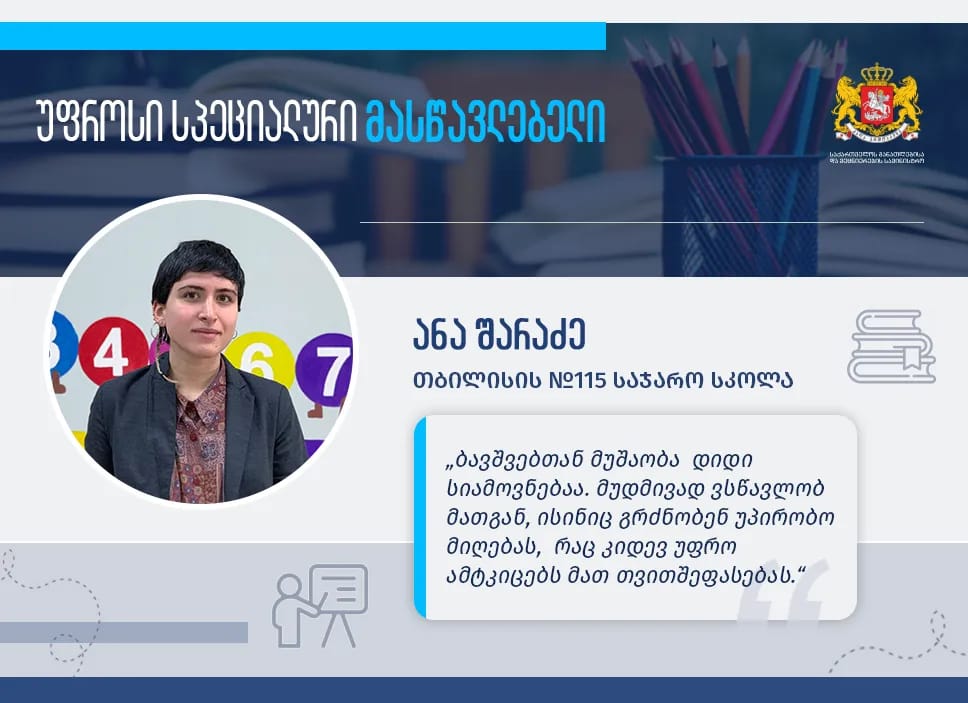 "While in my third year of psychology, I studied the subject of inclusive education, which made me think about how many of my classmates' needs were left behind in the system, how different the school years would be if they had an individual approach to everyone. Consequently, I decided to learn more about this system. After hearing, experiencing and seeing the present environment at schools, I decided that I should be involved in creating an interesting, motivating and caring environment for all students.” - states Ana Sharadze.