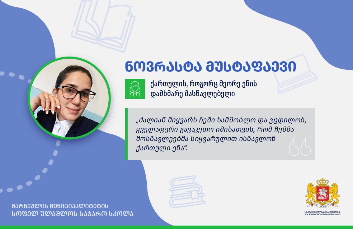 "I never thought I would become a teacher, but I am exactly where I need to be and where my presence is most needed" - said Novrasta Mustafayev, a senior teacher of Georgian as a second language, who has been teaching the state language at Ulashlo Public School in Marneuli Municipality for three years.