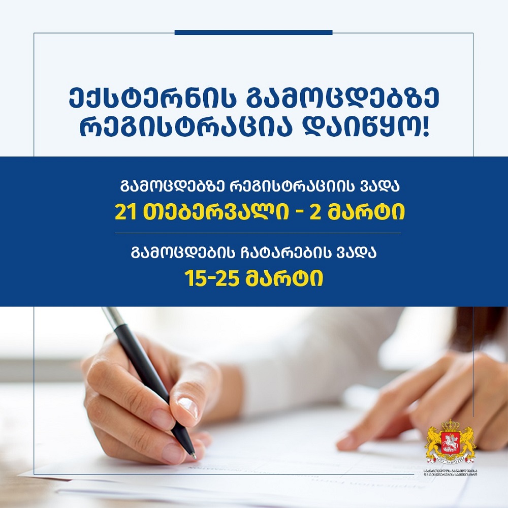 საქართველოს განათლებისა და მეცნიერების სამინისტრომ I-XII კლასების პროგრამის ექსტერნატის ფორმით დაძლევის მსურველთათვის რეგისტრაციისა და გამოცდების ჩატარების ვადები განსაზღვრა. მსურველი პირები გამოცდაზე დარეგისტრირებას 2022 წლის 21 თებერვლიდან 2 მარტის ჩათვლით შეძლებენ, ხოლო გამოცდები 2022 წლის 15 მარტიდან 25 მარტის ჩათვლით ჩატარდება. გამოცდაზე გასვლის უფლება აქვს პირს იმ შემთხვევაში, თუ მისი ასაკი შეესაბამება ან აღემატება ექსტერნის წესით დასაძლევი კლასის მოსწავლეთა ასაკობრივ ჯგუფს და მას დაძლეული აქვს წინმსწრები კლასის საგანმანათლებლო პროგრამა.
