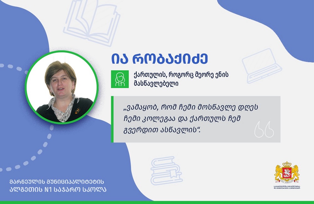 მშობლიურ ენას ია რობაქიძე ამჟამად მარნეულის მუნიციპალიტეტის სოფელ ალგეთის N1 საჯარო სკოლის მოსწავლეებს ასწავლის. პროფესიით ფილოლოგმა ქართულ ენასა და ლიტერატურაში კომპეტენცია 2010 წელს, პედაგოგთა სასერტიფიკატო გამოცდების შემოღებისთანავე დაადასტურა: „არც მიყოყმანია, როგორც კი დაინიშნა, მაშინვე გავედი გამოცდაზე. მევალებოდა კიდეც, რადგან იმ დროს სკოლის დირექტორი ვიყავი და კოლეგებისთვის მაგალითი უნდა მიმეცა“, – იხსენებს უფროსი პედაგოგი, რომელმაც 2014 წელს ქართულის, როგორც მეორე ენის გამოცდა ჩააბარა. სტატუსის კიდევ უფრო ასამაღლებლად ის კომპეტენციის დადასტურებას სულ მალე წამყვანი და მენტორი მასწავლებლობის მსურველთა გამოცდაზე შეეცდება.