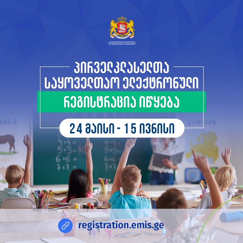 საქართველოს განათლებისა და მეცნიერების სამინისტრო 24 მაისს, დილის 09:00 საათიდან საქართველოს ზოგადსაგანმანათლებლო დაწესებულებებში პირველკლასელთა საყოველთაო ელექტრონულ რეგისტრაციას იწყებს, რომელიც 15 ივნისს დღის ბოლოს დასრულდება.