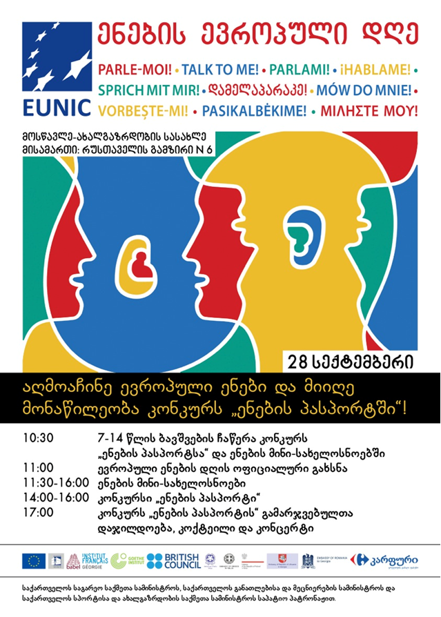 EUNIC (ევროკავშირის კულტურულ ინსტიტუციათა გაერთიანება) მოხარულია მოგიწვიოთ ენების ევროპულ დღეზე, რომელიც 2013 წლის 28 სექტემბერს თბილისში გაიმართება.