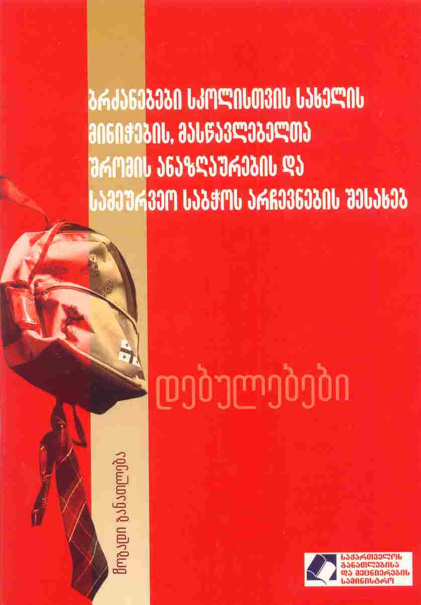 „ბრძანებები სკოლისთვის სახელის მინიჭების, მასწავლებელთა შრომის ანაზღაურების და სამეურვეო საბჭოს არჩევნების შესახებ“ აერთიანებს შემდეგ ნორმატიულ აქტებს: „საჯარო სკოლისათვის სახელის მინიჭების წესი“: განსაზღვრავს საქართველოს ტერიტორიაზე არსებული საჯარო ... |