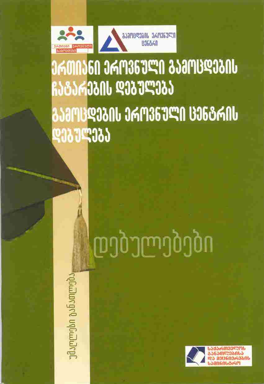 „ერთიანი ეროვნული გამოცდების ჩატარების დებულება“ „გამოცდების ეროვნული ცენტრის დებულება“ არეგულირებს აკრედიტებულ უმაღლეს საგან-მანათლებლო დაწესებულებებში ჩარიცხვისა და აბიტურიენტების მიერ სახელმწიფო სასწავლო გრანტის მოპოვების პირობებს, აგრეთვე ერთიანი ეროვნული გამოცდების ორგანიზაციის საკითხებს.