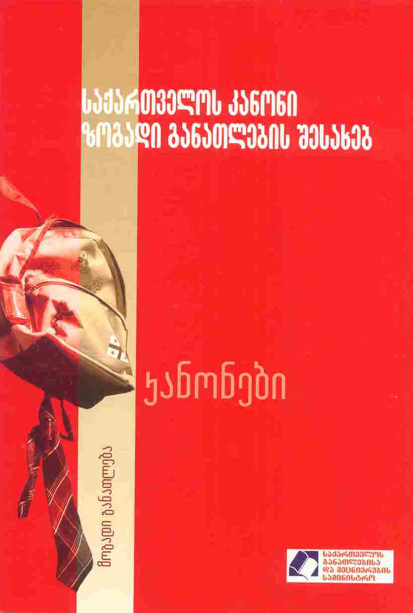 „საქართველოს კანონი ზოგადი განათ-ლების შესახებ“ აწესრიგებს საქართველოში ზოგადსაგანმანათლებლო საქმიანობის განხორციელების პირობებს, ზოგადი განათლების მართვისა და დაფინანსების პრინციპებსა და წესს, ადგენს ყველა ზოგადსაგანმანათლებლო დაწესებულების სტატუსს, მათი დაფუძნების, საქმიანობის, რეორგანიზაციის, ლიკვიდაციისა და აკრედიტაციის წესს, ... |