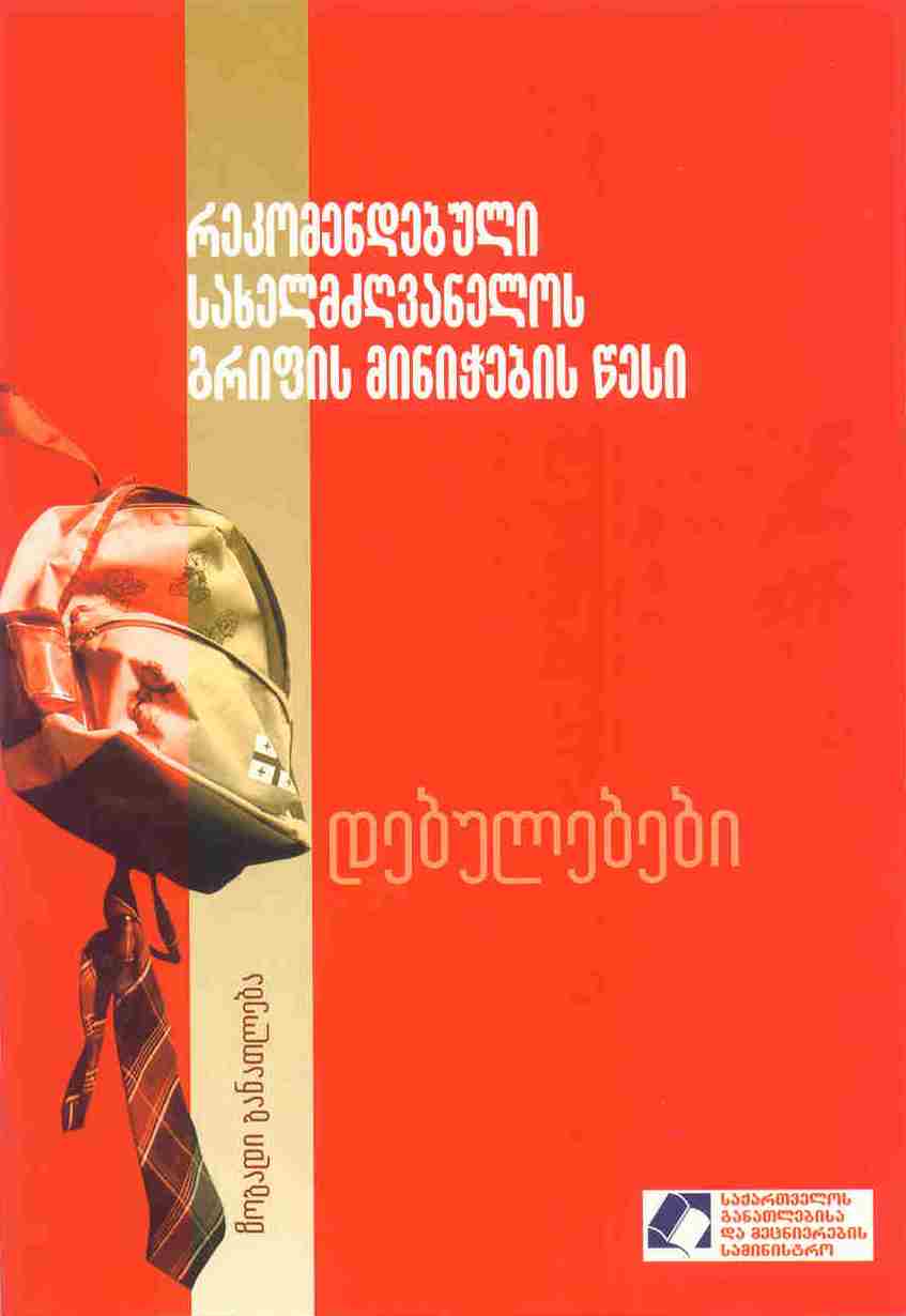 „რეკომენდებული სახელმძღვანელოს გრიფის მინიჭების წესი“ არეგულირებს ზოგადსაგანმანათლებლო დაწესებულებებში სასწავლო პროცესისათვის გამოსაყენებელი სახელმძღვანელოების გრიფის მინიჭების პროცედურას. ამ წესის დამტკიცების შესახებ საქართველოს განათლებისა და მეცნიერების მინისტრის 2006 წლის 11 მაისი N428 ... |